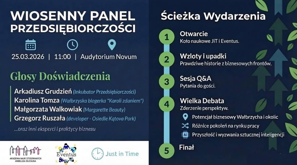 Z przyjemnością informujemy, że Wałbrzyski Inkubator Przedsiębiorczości będzie aktywnie uczestniczył w tym wydarzeniu, organizowanym przez Koło Naukowe Just in Time oraz Eventus.
